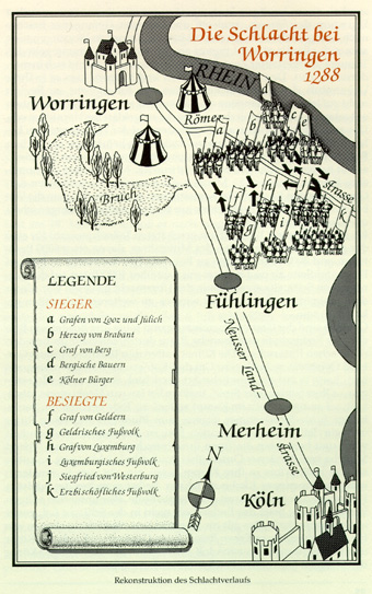 La Bataille eut lieu le 5 juin 1288 près de la ville de Worringen (Woeringen), à une vingtaine de Klm au Nord de Cologne et non loin du Rhin. Elle avait pour objet la possession du Duché du Limbourg.